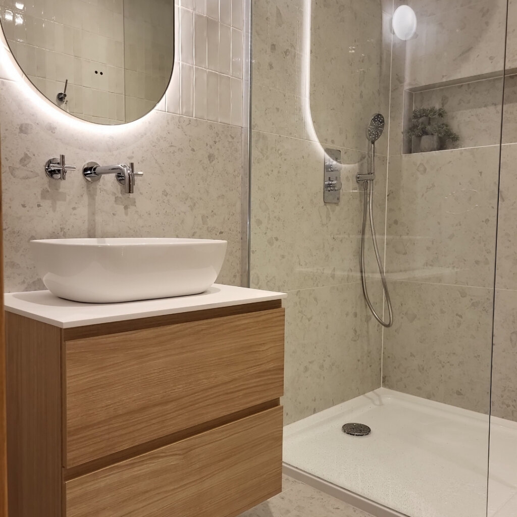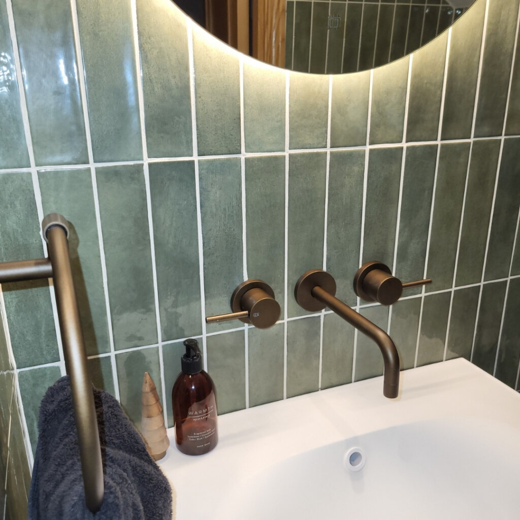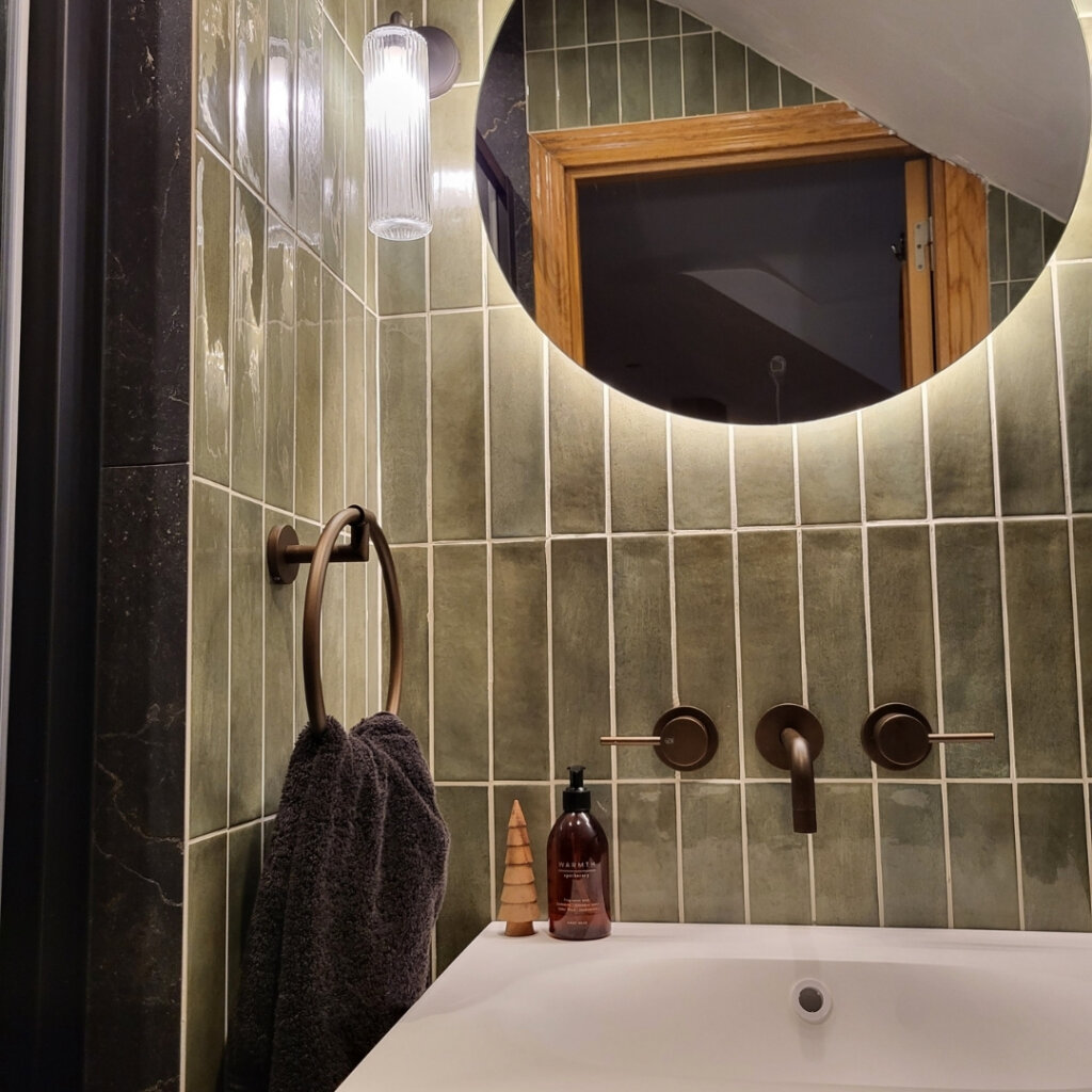 Home > Case Studies > Bespoke Bathroom Design: Castleknock Bespoke Bathroom Design: Castleknock Client Family Home Location Castleknock Project Type Bathroom Transformation Designer Rebecca Moran & Sarah Fox The project involved the design and spatial planning of three ensuites (master, boys’, and girls’) in a recent Castleknock home. Designer Rebecca Moran worked closely with the clients and interior designer Sarah Fox of Brock Finucane to deliver a “soft luxury” aesthetic, balancing high-end materials with a focus on elegance, comfort, and practical, everyday usability. The Challenge The primary objective was to make the best use of space, particularly within the Master Ensuite, where spatial constraints required a layout that maximised the footprint. In the Boys’ Ensuite, a sloped ceiling required a specific approach to ensure the correct enclosure was fitted to the space while remaining fully functional. The Solution Master Ensuite: We embraced a richer direction, combining deep green small-format tiles with large-format black marble featuring warm gold veining and dark bronze Gessi brassware. Paired with warm, layered lighting and natural wood elements, the space evokes a calming, spa-like environment. To improve flow and accessibility, a pivot door was installed, ensuring the layout remains functional and open. The Ensuites: Balanced Functionality For the two additional ensuites, we paired refined aesthetics with practical functionality. This was achieved through a considered mix of large and small format tiles within a clean monochrome palette, complemented by sleek chrome fittings. The Girls’ Ensuite: A bespoke natural wood vanity unit with a countertop basin was introduced to add warmth and tactility. This serves as a subtle focal point while reinforcing the overall intent of refined simplicity. The Boys’ Ensuite: To accommodate the sloped ceiling, we selected a corner entry enclosure. This practical choice ensures a comfortable shower area that works seamlessly within the room’s unique architecture. Features such as an overhead rainfall shower and a bifold shower door further enhance the utility of the compact layouts, delivering a luxurious and elegant experience without compromise. Related Product