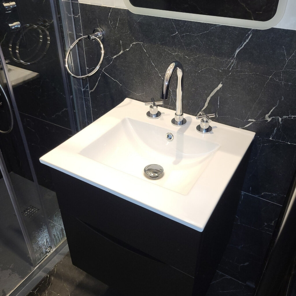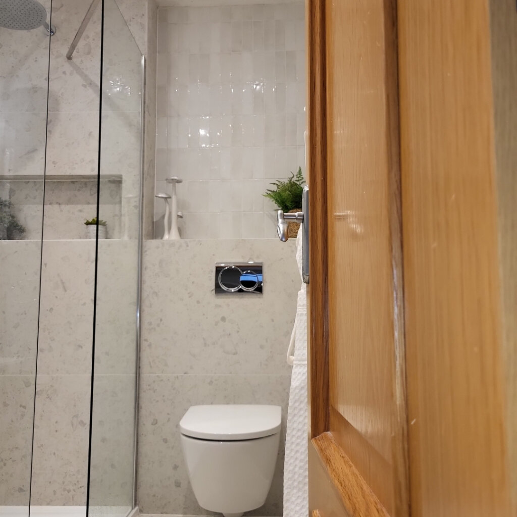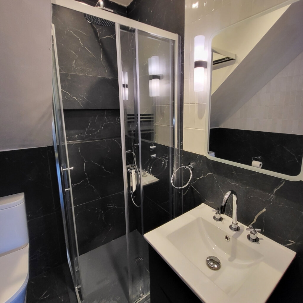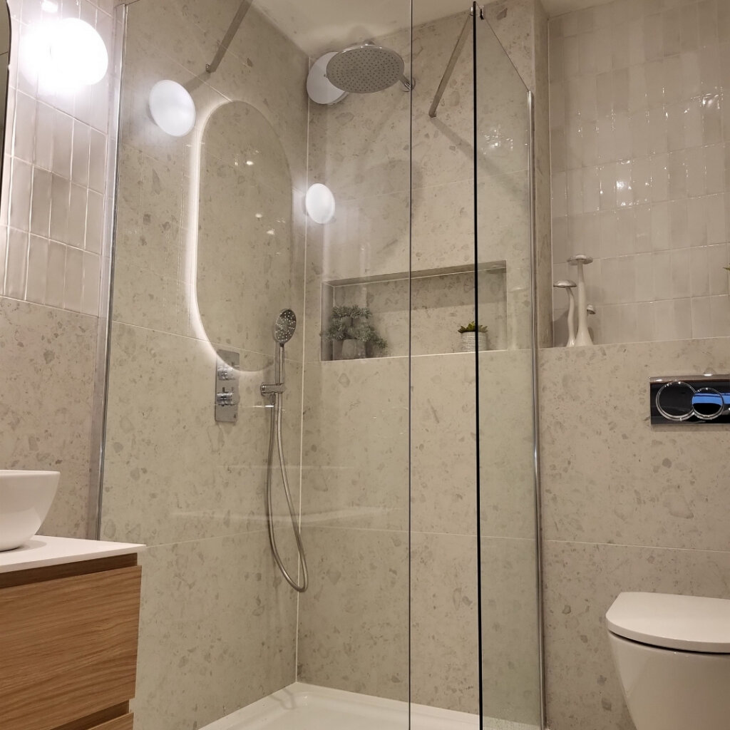 Home > Case Studies > Bespoke Bathroom Design: Castleknock Bespoke Bathroom Design: Castleknock Client Family Home Location Castleknock Project Type Bathroom Transformation Designer Rebecca Moran & Sarah Fox The project involved the design and spatial planning of three ensuites (master, boys’, and girls’) in a recent Castleknock home. Designer Rebecca Moran worked closely with the clients and interior designer Sarah Fox of Brock Finucane to deliver a “soft luxury” aesthetic, balancing high-end materials with a focus on elegance, comfort, and practical, everyday usability. The Challenge The primary objective was to make the best use of space, particularly within the Master Ensuite, where spatial constraints required a layout that maximised the footprint. In the Boys’ Ensuite, a sloped ceiling required a specific approach to ensure the correct enclosure was fitted to the space while remaining fully functional. The Solution Master Ensuite: We embraced a richer direction, combining deep green small-format tiles with large-format black marble featuring warm gold veining and dark bronze Gessi brassware. Paired with warm, layered lighting and natural wood elements, the space evokes a calming, spa-like environment. To improve flow and accessibility, a pivot door was installed, ensuring the layout remains functional and open. The Ensuites: Balanced Functionality For the two additional ensuites, we paired refined aesthetics with practical functionality. This was achieved through a considered mix of large and small format tiles within a clean monochrome palette, complemented by sleek chrome fittings. The Girls’ Ensuite: A bespoke natural wood vanity unit with a countertop basin was introduced to add warmth and tactility. This serves as a subtle focal point while reinforcing the overall intent of refined simplicity. The Boys’ Ensuite: To accommodate the sloped ceiling, we selected a corner entry enclosure. This practical choice ensures a comfortable shower area that works seamlessly within the room’s unique architecture. Features such as an overhead rainfall shower and a bifold shower door further enhance the utility of the compact layouts, delivering a luxurious and elegant experience without compromise. Related Product